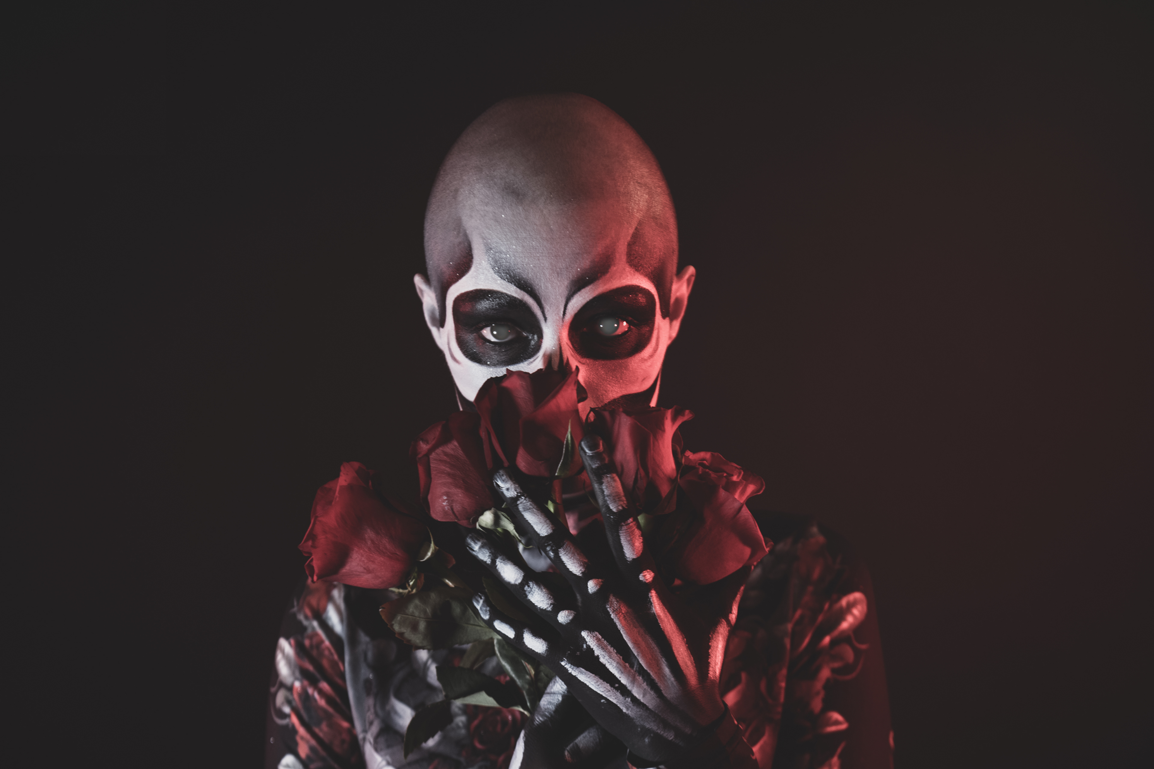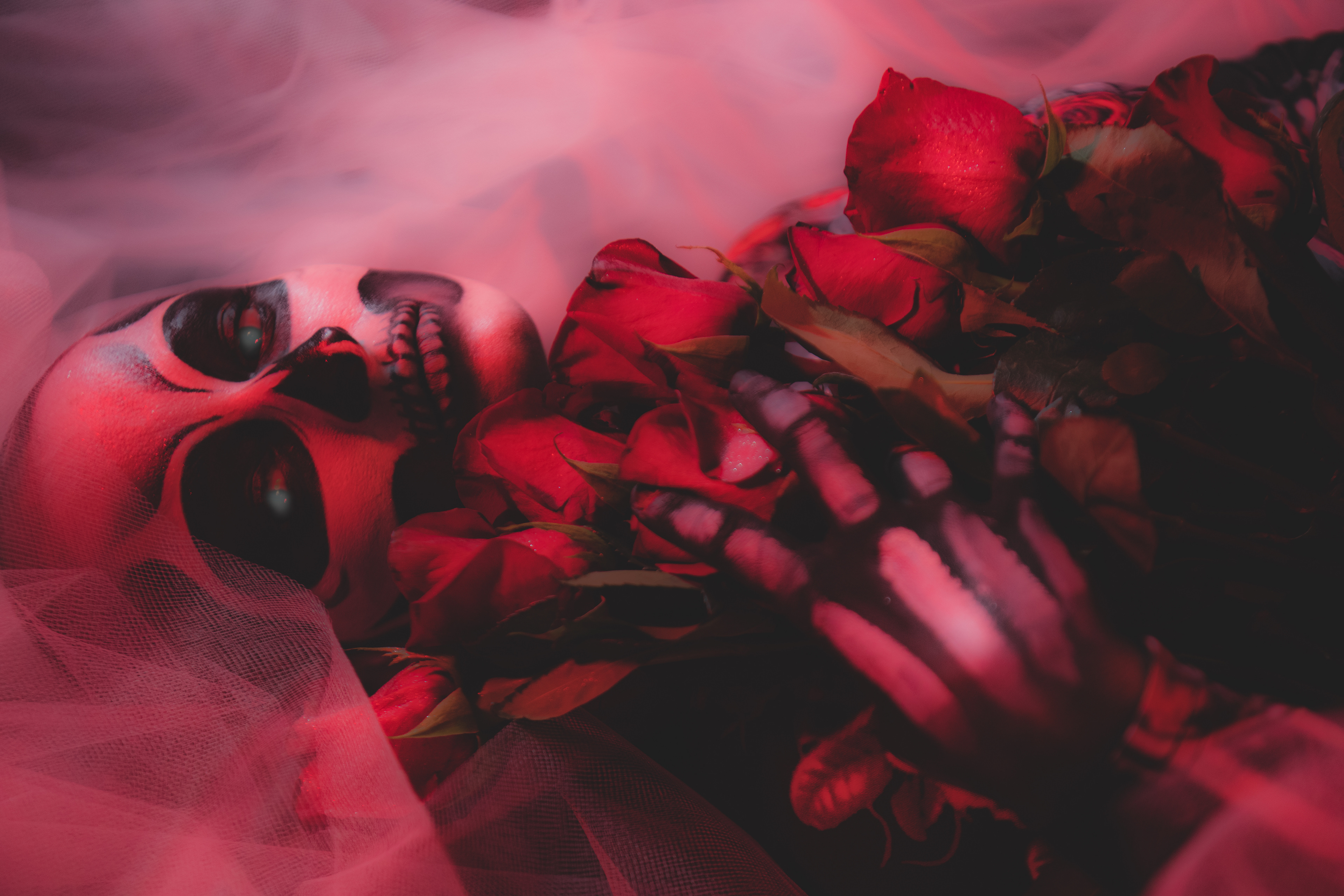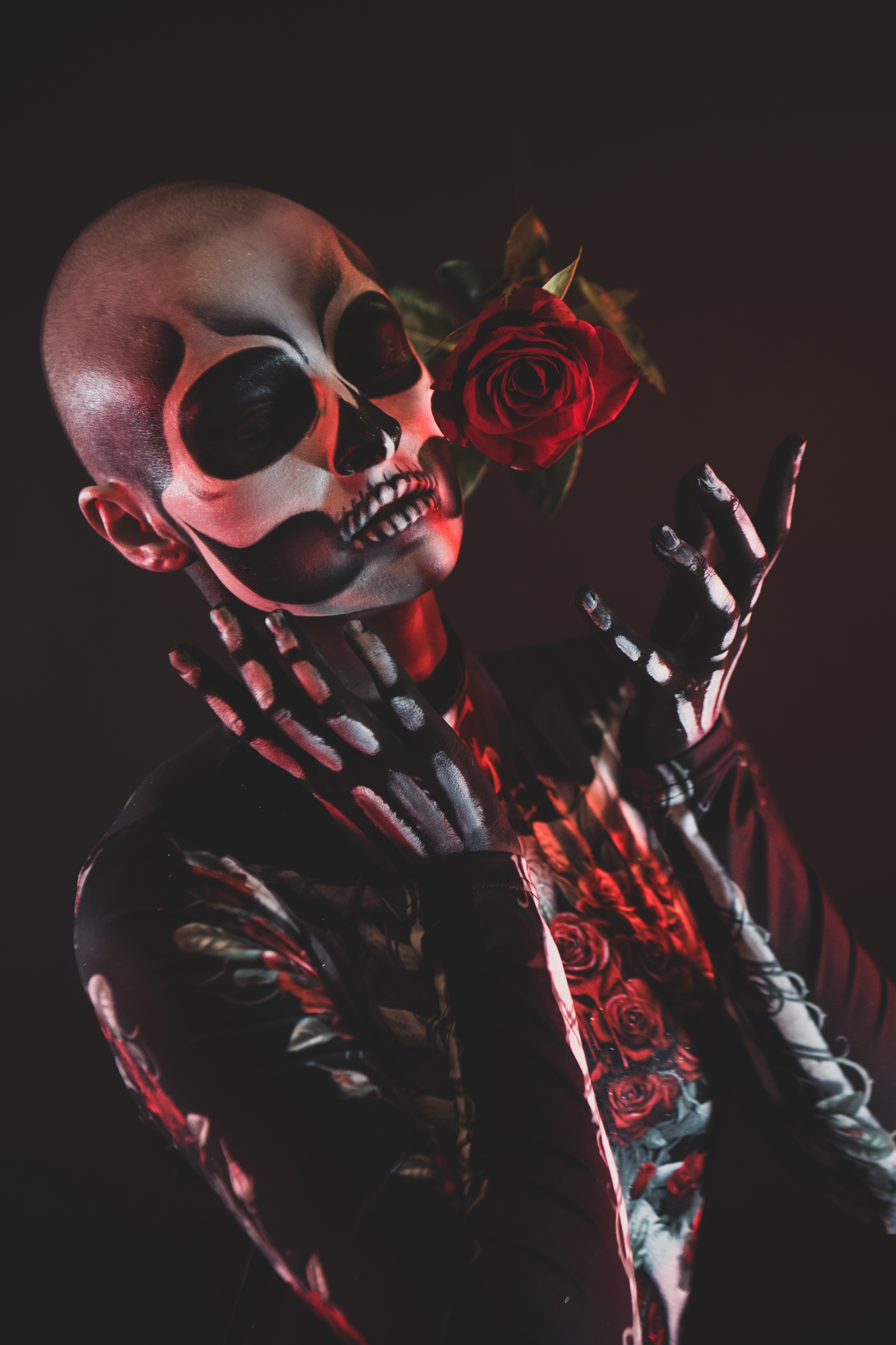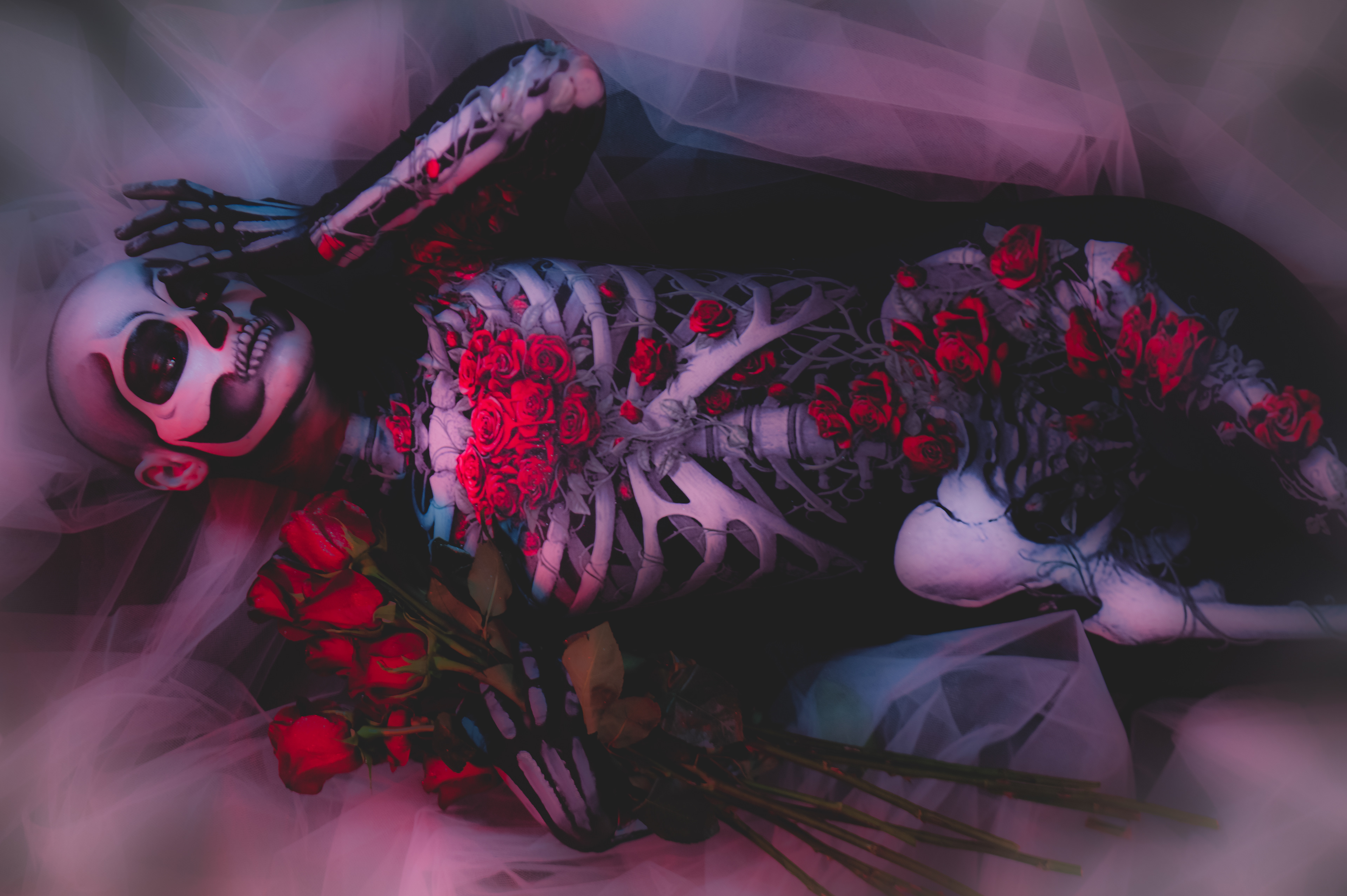 Skeleton and Roses concept shoot, Skull and hand makeup done by Myself (Kori Battista) Photography and edit done by my friend, Joe W! This shoot was so fun, and we had a blast creating the whimsical floating roses, and the creepy yet ethereal vibe.
